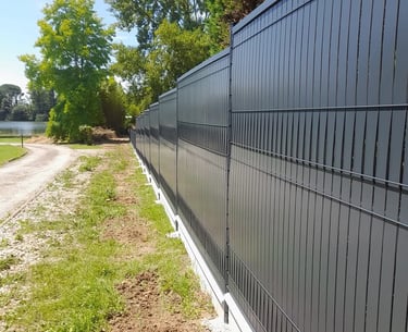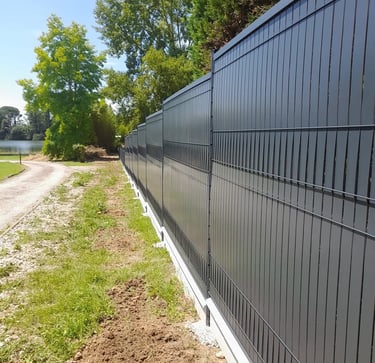 Pose de 125ml de clôture en panneaux grillages avec soubassement en dalle béton de 50cm et occultant en alu.